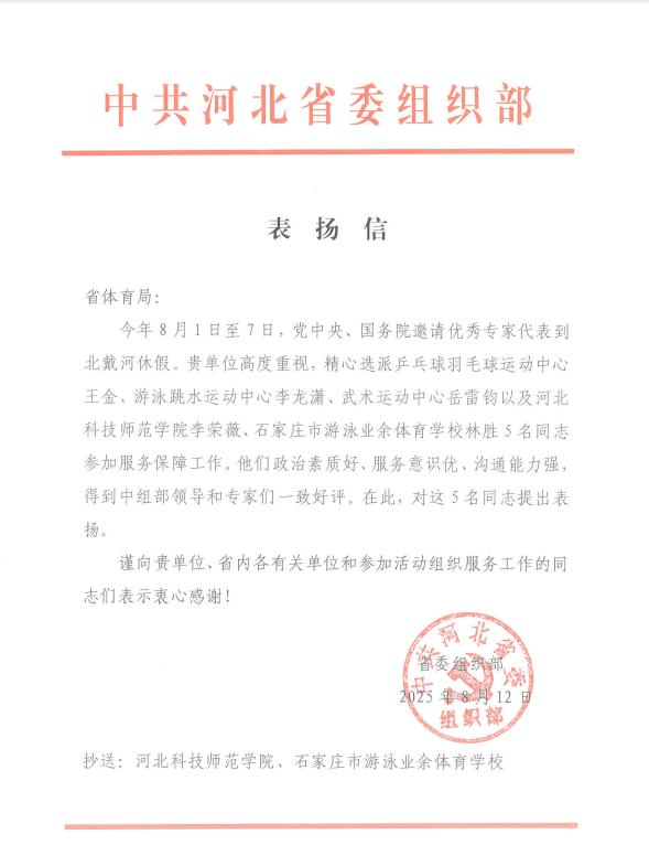 近日,中共河北省委组织部发来表扬信,对在今年8月1日至7日党中央、国务院邀请优秀专家代表北戴河休假活动中表现突出的服务保障人员予以表扬,公司党员教师李荣薇位列其中。
