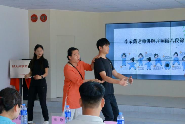 活动期间,公司李荣薇老师为村民进行了八段锦教学。她详细讲解了八段锦在调理脏腑、疏通经络方面的中医养生原理,并进行了规范动作示范。村民积极参与学习,亲身感受了中华传统体育文化对身心健康的促进作用,普遍反映锻炼后身体舒展、活力增强。潘佳彬老师组织村民体验了瑜伽课程。她介绍了瑜伽在缓解压力、改善体态方面的积极作用,并带领村民进行了基础体式练习。活动现场氛围专注平和,村民对能够在乡村接触到此类身心锻炼方式表示欢迎,认为有助于提升日常生活质量。针对农村常见的腰腿疼痛问题,蔡志敏老师开展了专项健康知识讲座。她深入浅出地分析了常见疼痛的诱因,如劳损姿势、季节变化等,并提供了实用建议。在随后的互动环节,蔡老师耐心解答村民疑问,并运用针灸、推拿等手法为多位村民缓解了不适症状,其专业服务受到现场村民的普遍认可。同时,“沐光同行”暑期社会实践队成员也为二十余位村民提供了肩颈按摩服务。