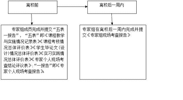 1.专家撰写《专家个人现场报告》,报组长审核同意,并 在离校前向秘书提交“五表一报告” 2.专家组长撰写《专家组现场考查报告》,并征求每位专家意见后修改定稿 3.专家组长与公司领导和院系负责人交流反馈意见 |