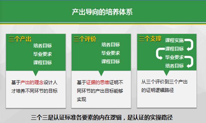 本次师范类专业认证,OBE是专业人才培养体系设定的原则性理念,即“产出导向的人才培养体系”,认证关注点可以概括为“三个三”。